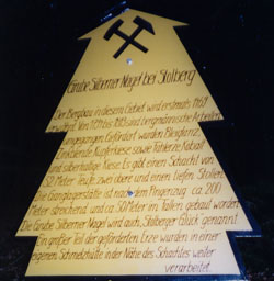 1002 Grube Silberner Nagel bei Stolberg Der Bergbau in diesem Gebiet wird erstmals 1469 erwähnt. Von 1794 bis 1813 sind bergmännische Arbeiten umgegangen. Gefördert wurden Bleiglanz, Zinkblende, Kupferkies, sowie Fahlerze, Kobald und silberhaltige Kiese. Es gibt einen Schacht von 52 Meter Teufe, zwei obere und einen tiefen Stollen. Die Ganglagerstätte ist nach dem Pingenzug ca. 200 Meter streichend und ca. 50 Meter im Fallen gebaut worden. Die Grube Silberner Nagel wird auch "Stolberger Glück" genannt. Ein großer Teil der geförderten Erze wurden in einer eigenen Schmelzhütte in der Nähe des Schachtes weiter verarbeitet. |